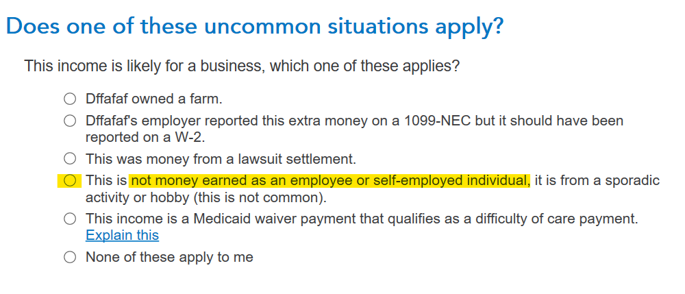 When you’re done, we’ll ask you a few questions and help you through entering any expenses you may have so that you can reduce your taxable income. TurboTax will assume this is self-employment income and generate a Schedule C. After you enter it, there is a screen that asks about uncommon situations that apply. If this is not self-employment income, you will need to indicate that on that screen. Am I self-employed?