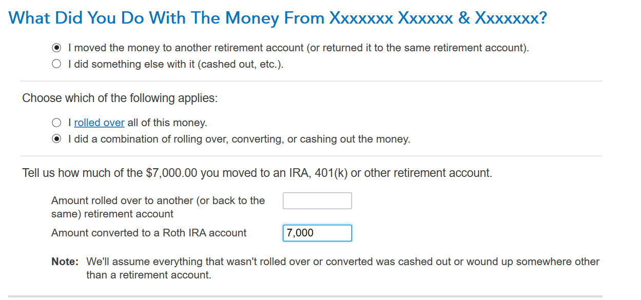 Thank you for the token. I reviewed your return. You selected "rolled over all of this money" instead of “I did a combination of rolling over, converting, or cashing out money” on the "What did you do with the money" screen.