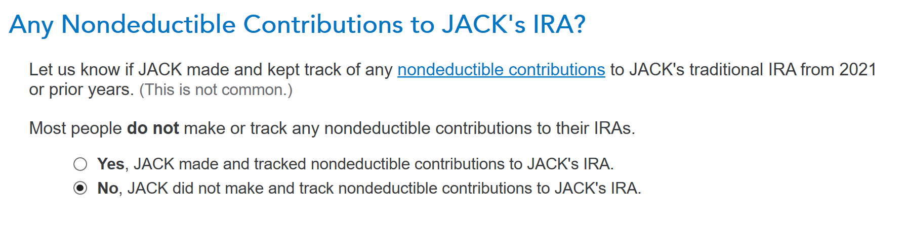 Thank you for the token. I reviewed your return. You didn't have any nondeductible traditional IRA contribution for 2020? I didn't see any contributions entered.