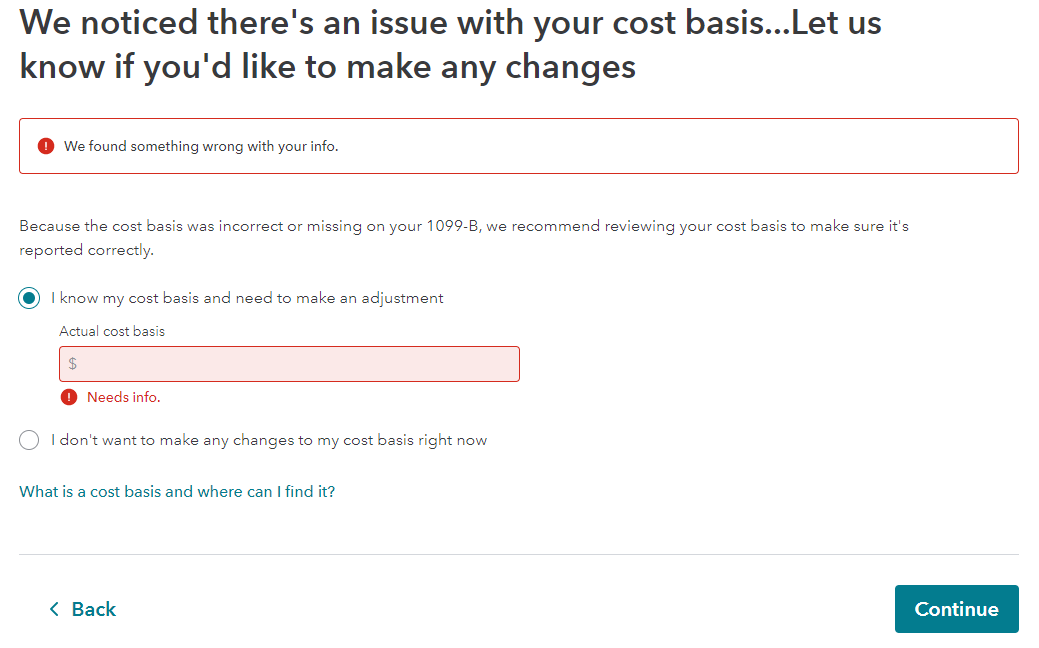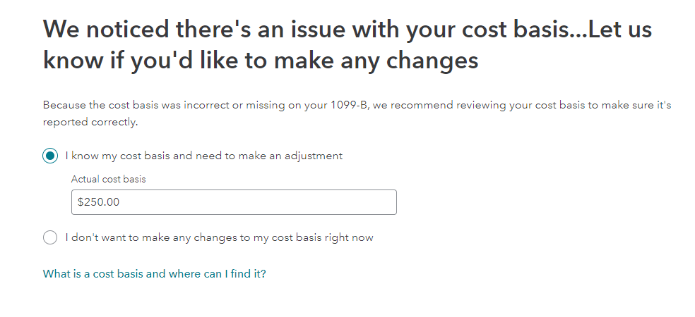 The screen that contains step number 4 is entitled We noticed there's an issue with cost basis...Let us know if you'd like to make any changes. On that screen is the option I know my cost basis and need to make an adjustment.