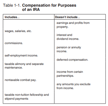 The screenshot below shows Table 1-1 Compensation for Purposes of an IRA from IRS Pub. 590-A - Contributions to Individual Retirement Arrangements (IRAs) [p. 6]