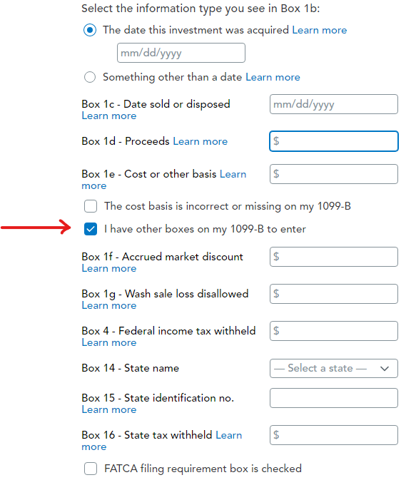 In TurboTax Desktop, if you are entering stock sales One by one, you may add transaction detail as well as Other boxes on my 1099-B. See here.