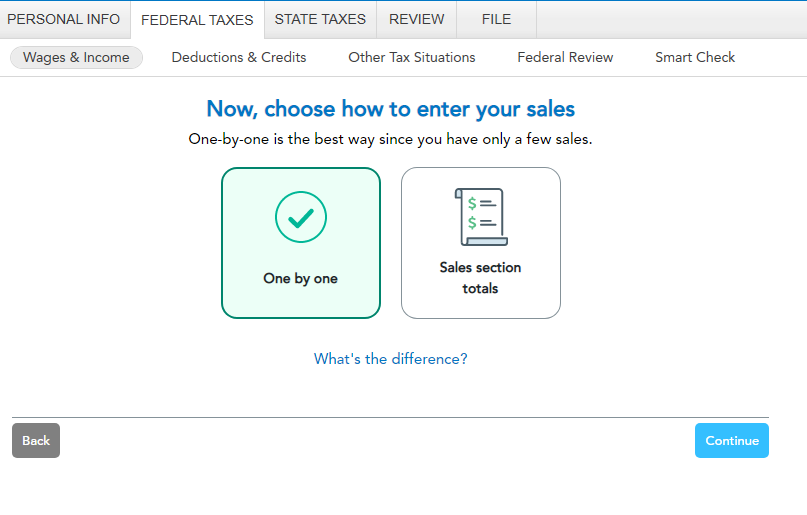 1. The 2022 version allowed one to switch from total to individual sales. I don't find that option with the new screen for 2023. Must delete all entries and start over if you want to switch.
