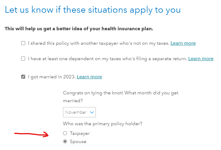 You were covered for health insurance purposes under your parent's plan and reported that information on your jointly filed tax return. I do not understand how your husband was reported as the recipient. Do you mean that your spouse was selected as the primary policy holder at the screen Let us know if these situations apply to you?