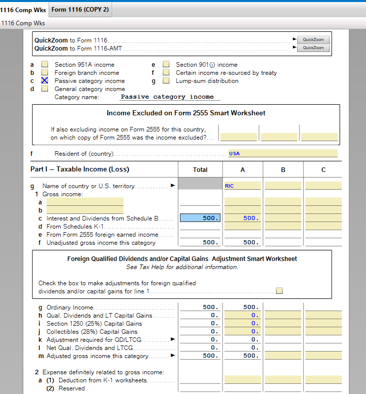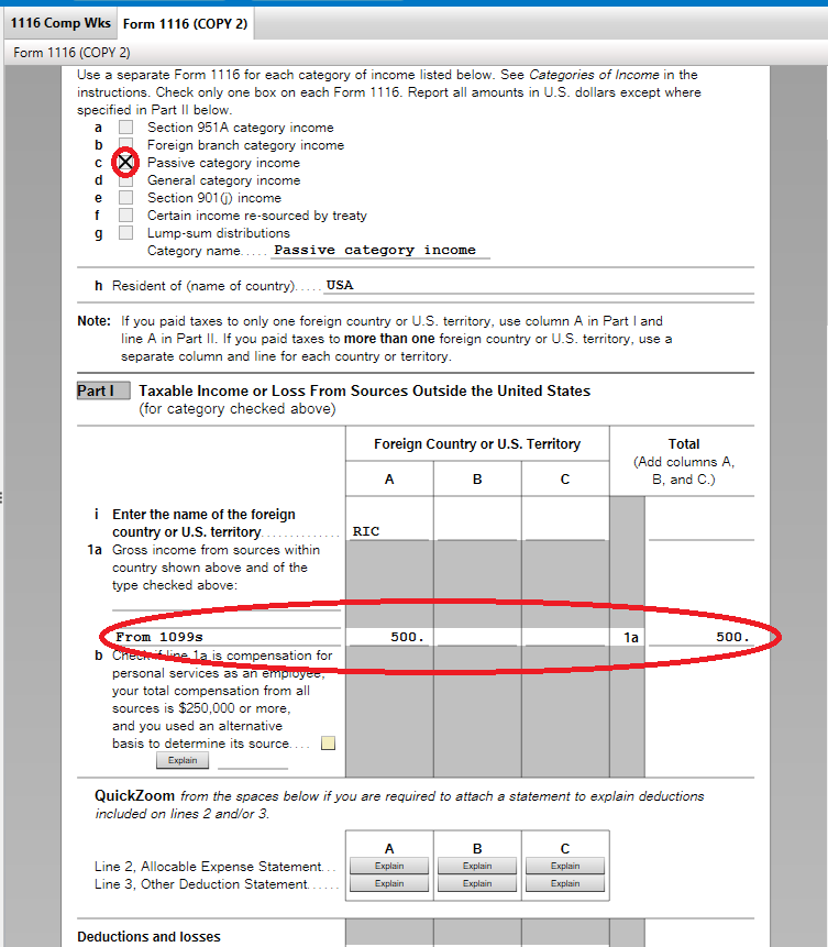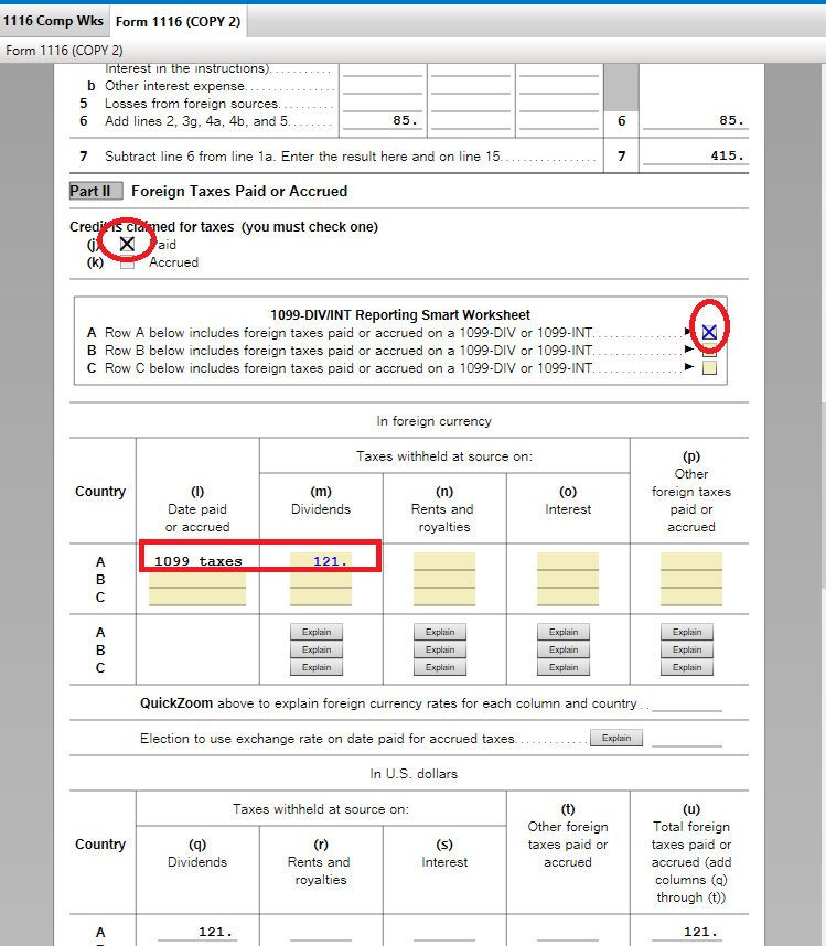 Form 1116 line 1a shows zero amounts for my 1099s-foreign dividends. It is getting the information from the Foreign tax credit computation worksheet Part 1-g-1a when the foreign dividends from schedule B is reported on Part 1-g-1c.