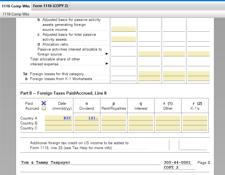 If I can enter the correct amount to report for each country for the 1099 Div of H and W during the Shedule B entry, the amounts that will transfer to Form 1116 line 1(a) will be correct and my problem will be solved. What am I doing wrong? I am using TT Premier. HELP...