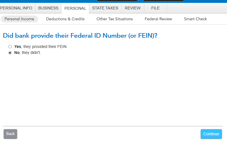 Just answer "NO" to "Did bank provide their Federal ID Number (or FEIN)? If, you did not receive a 1099-INT.
