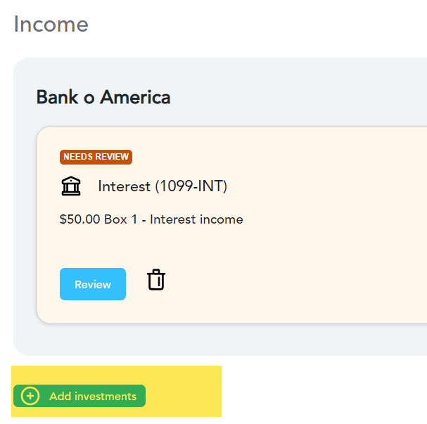 After you enter the first one, you will see a button that says +Add Another 1099-INT or +Add Investments