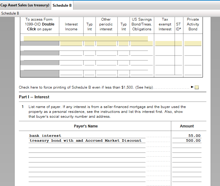 The amount should automatically transfer to Schedule B, Part I, Interest. If this is not happening, delete your 1099-B and the Capital Asset Worksheet and re-enter manually.