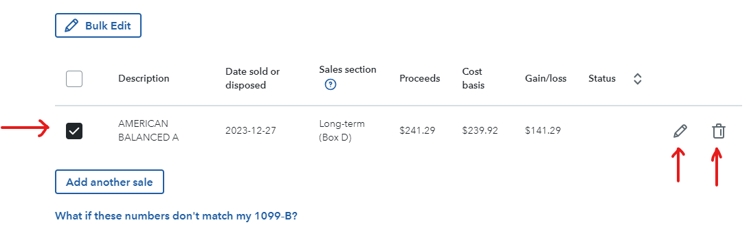 In TurboTax Online, you will find two options to edit the entries downloaded from your broker and one option to delete the entry.