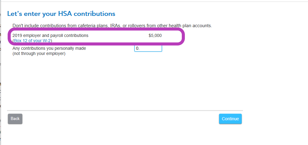 Your total HSA contribution limit should be $8,000. Click here to verify: 2019 HSA contribution limit. If your employer has reported the contribution amount on your W-2, you should have it coded as W box 12 on your W-2. You do not enter any additional amount in the program. See the image below: