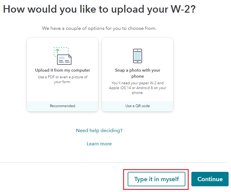 On the screen How would you like to upload your W-2? click on Type it in myself