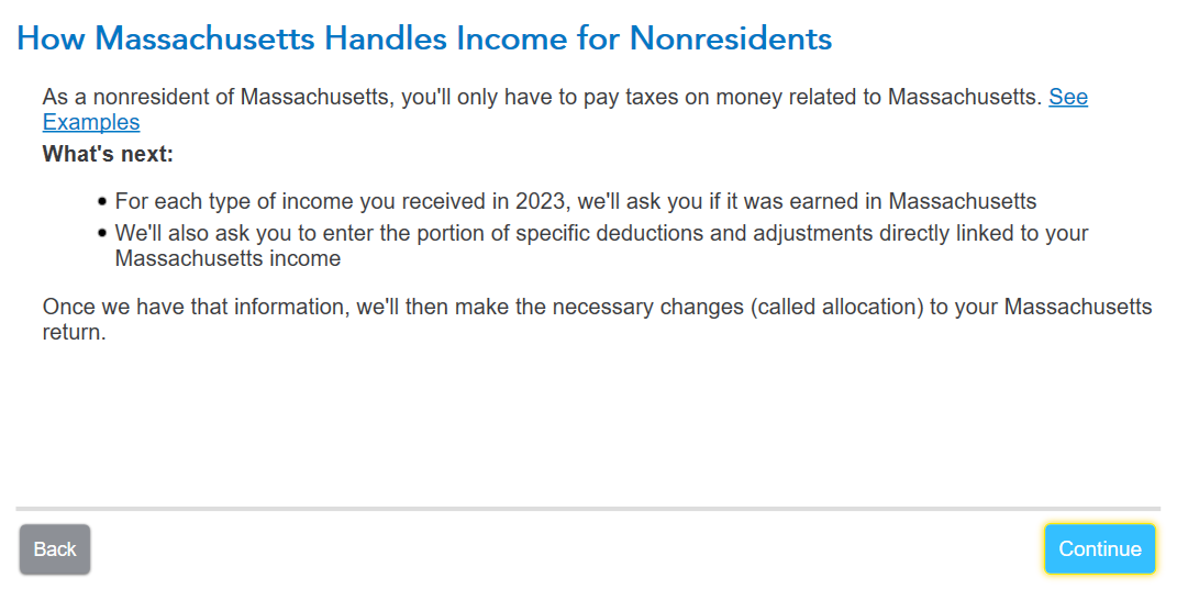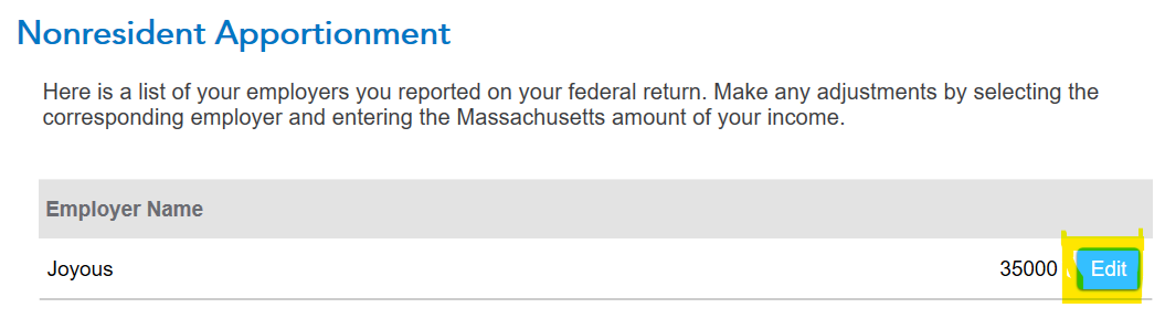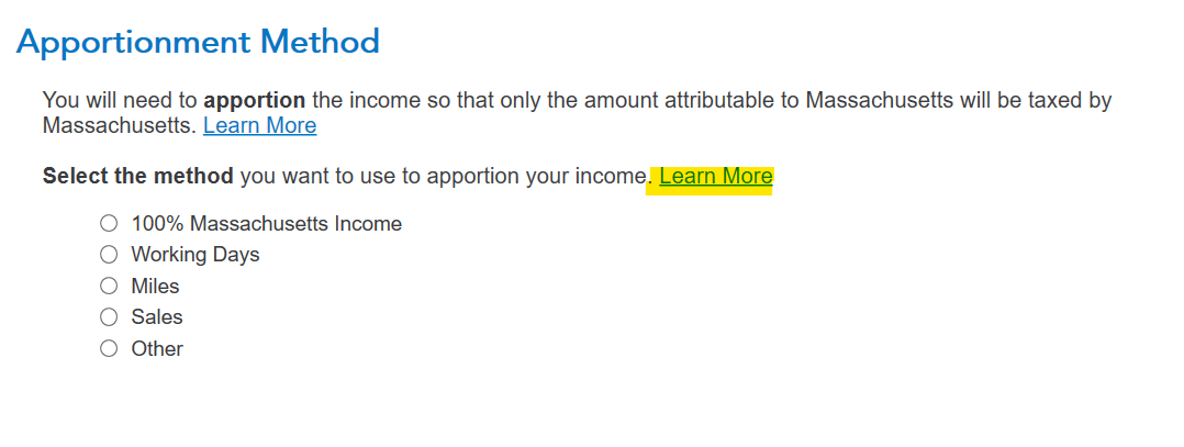 So I live in NH and work remotely 4 days a week. I work 1 day a week in MA. It comes to about 300 hours a year that I physically work in MA. Not really sure how to do this with TurboTax Online. Has anyone done this before? This will be the first year that I do this since the COVID/remote work restrictions have lapsed. For the last few years even though I have worked remote, I have just claimed that all of my working wages have been in MA.