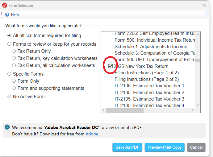 I'm having the same issue this year (2025), but not in prior years. I go to print only the Fed return, and the print dialogue shows printing both Fed and my two States. Likewise, when I only want to print an individual State, the Federal and other State are also called up to print in the print dialogue box. Confusing mess, plus I don't want to waste paper and toner by printing extra forms that I do not need. Surely this is a bug, and should have been fixed by now (2/28).