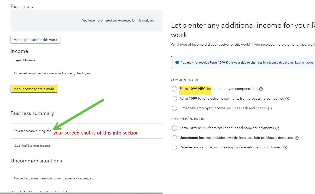 I have "Nonemployee compensation" box in my form 1099-NEC that is my income from this company. I need to enter it somewhere in turbotax but I dont know where (It does not ask). I also want to add that the 2 items in the attached image do not apply to me
