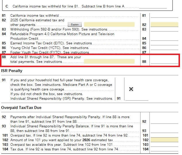 If you choose to take the credit instead of the deduction for California, add the credit amount on line 88, the total payment line, of the Form 540. To the left of the total, write “IRC 1341” and the amount of the credit.