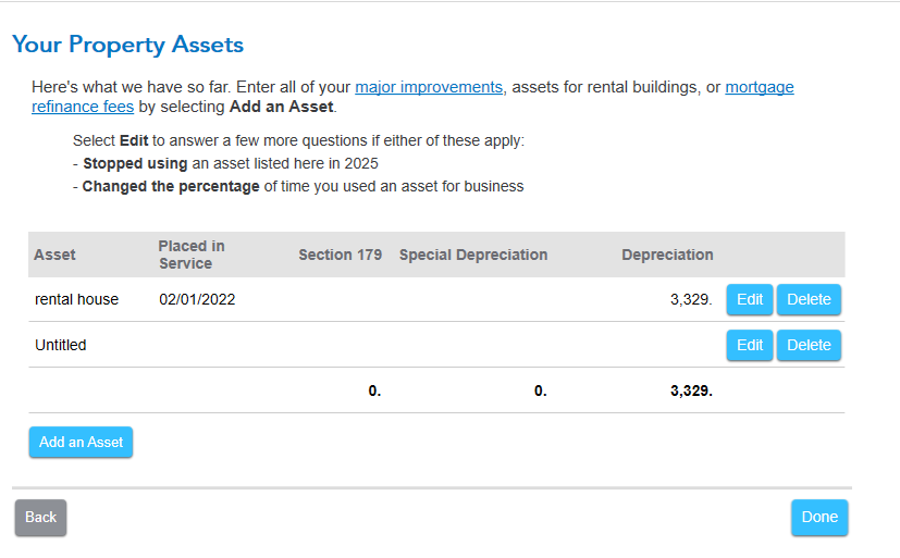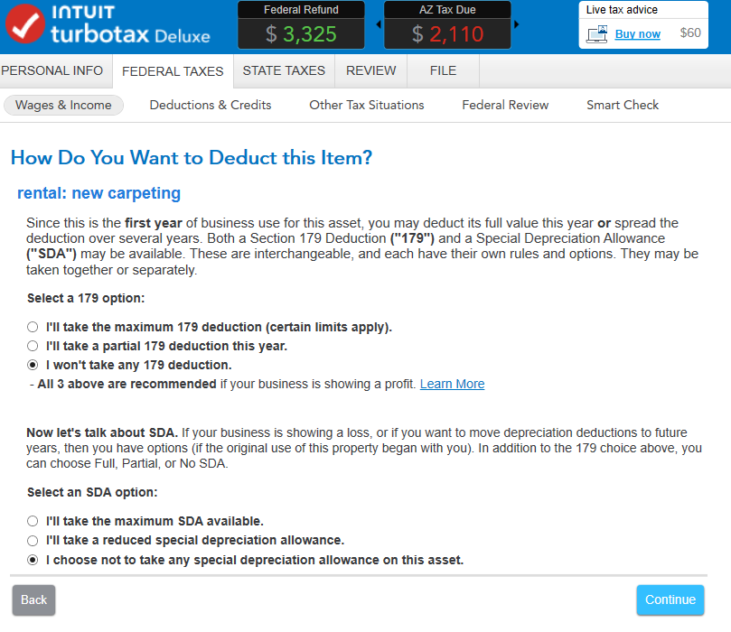You're then asked 'How Do You Want to Deduct this Item?' and are given several choices. Here's more detailed info on Depreciation of Business Assets and Rental Real Estate and Taxes to help you.