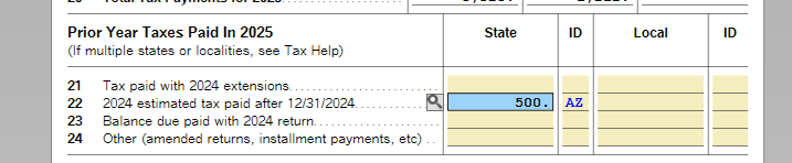 TurboTax Deluxe 2025 desktop for Mac. There appears to be an error on the Tax Payments Worksheet 2025, Line 22. Line 22 asks for "2024 estimated tax paid after 12/31/2024". TurboTax is entering the State amount actually paid in 2024, not the tax paid after 12/31/2024. This amount is coming from form Federal Carryover Worksheet under "2024 State Estimates Information" column (c) and "2024 State and Local Income Tax Information" column (c).