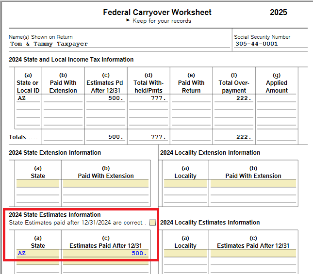 If Line 22 on the Tax Payment Worksheet shows an amount, check your Federal Carryover Worksheet to see if that amount also shows under State Estimates.