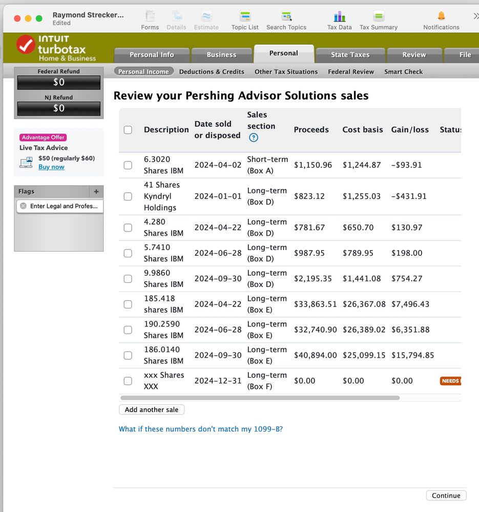 Hi. I'm not quite sure what else I can tell you. I use the desktop program (and have for many years). It is up to date. The Quick Entry table now has a phantom entry in position 9 for xxx shares XXX with $0.00 proceeds and $0.00 cost, labeled as an E. It was the best workaround I could devise. I don't know whether it will file or cause problems.