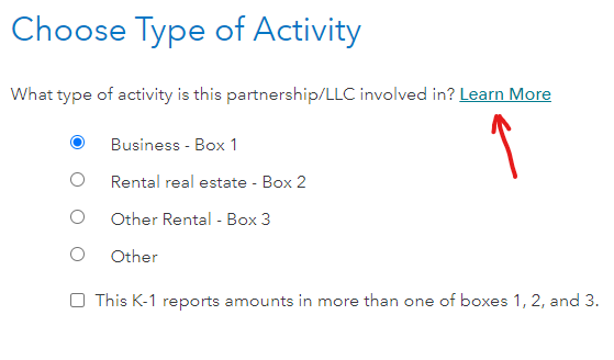 I assume that you entered all the real estate activity on one K-1 entry. Learn more at the screen Choose Type of Activity states: