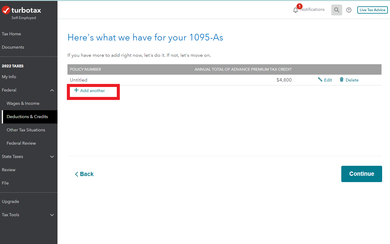 Type '1095-A' in the Search area, then click on 'Jump to 1095-a'. At the summary page, choose 'Add Another'.