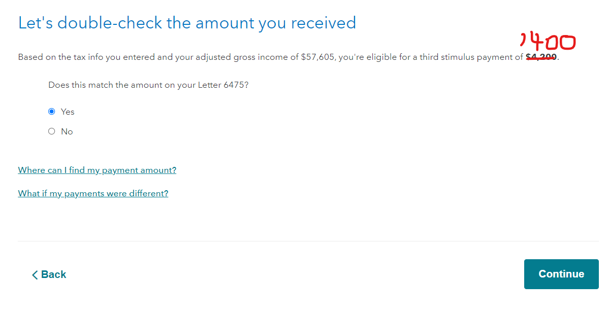 Even though you did not receive the 3rd stimulus check personally, the IRS can see that $1,400 was issued under your SSN. You should answer yes, otherwise, the IRS will adjust the amount of refund claimed on your return. We are entitled to receive only $1,400 once. Answer Yes to confirm that $1,400 is correct.