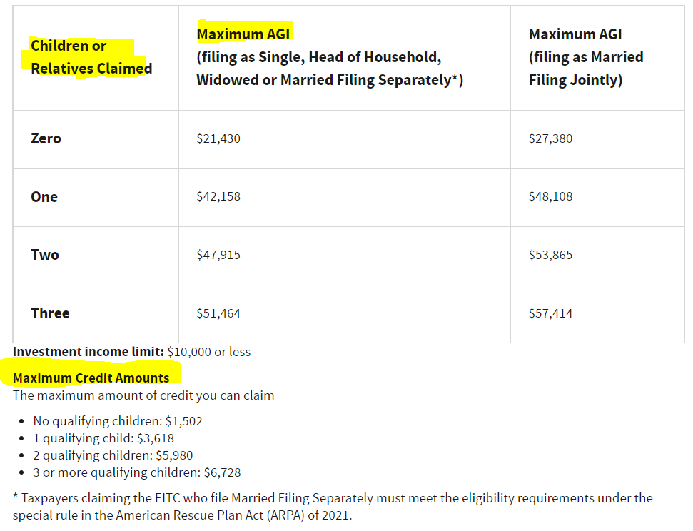 I am attaching the Earned Income Credit and Taxable Income Brackets images below for your reference.