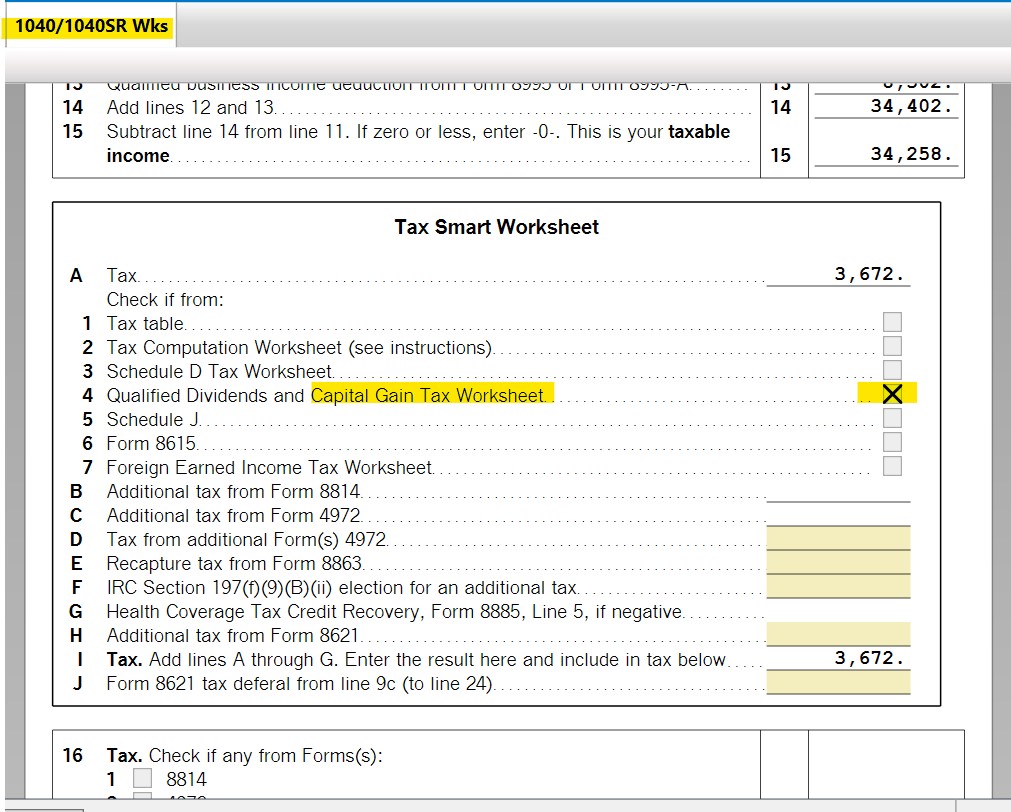 Look on the 1040/1040SR Wks - - not Form 1040, but the worksheet. Scroll down until you see Tax Smart Worksheet. In section A - what line is the X on? That X will tell you where you can see the calculation or if A1 has the X, you would use the tax table. Not all of your income is taxed at 22%.
