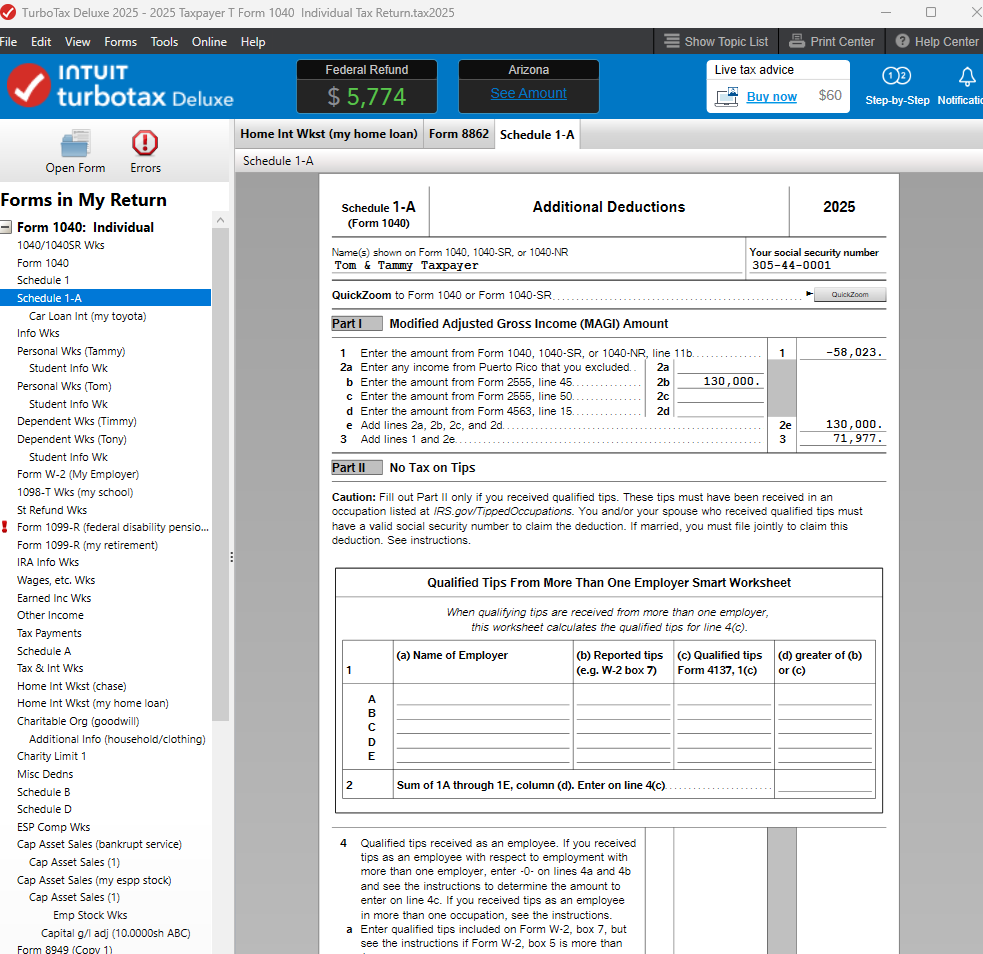 Turbotax is also not generating a Schedule 1-A form for me either despite qualifying for everything.