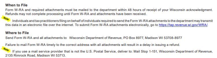 According to Question 6, What is the Wisconsin Form W-RA? What should I attach to the Form W-RA before submitting it? on the Wisconsin Department of Revenue's Homestead Credit Electronically Filed Claims page, required attachments include: