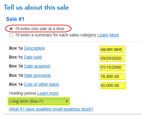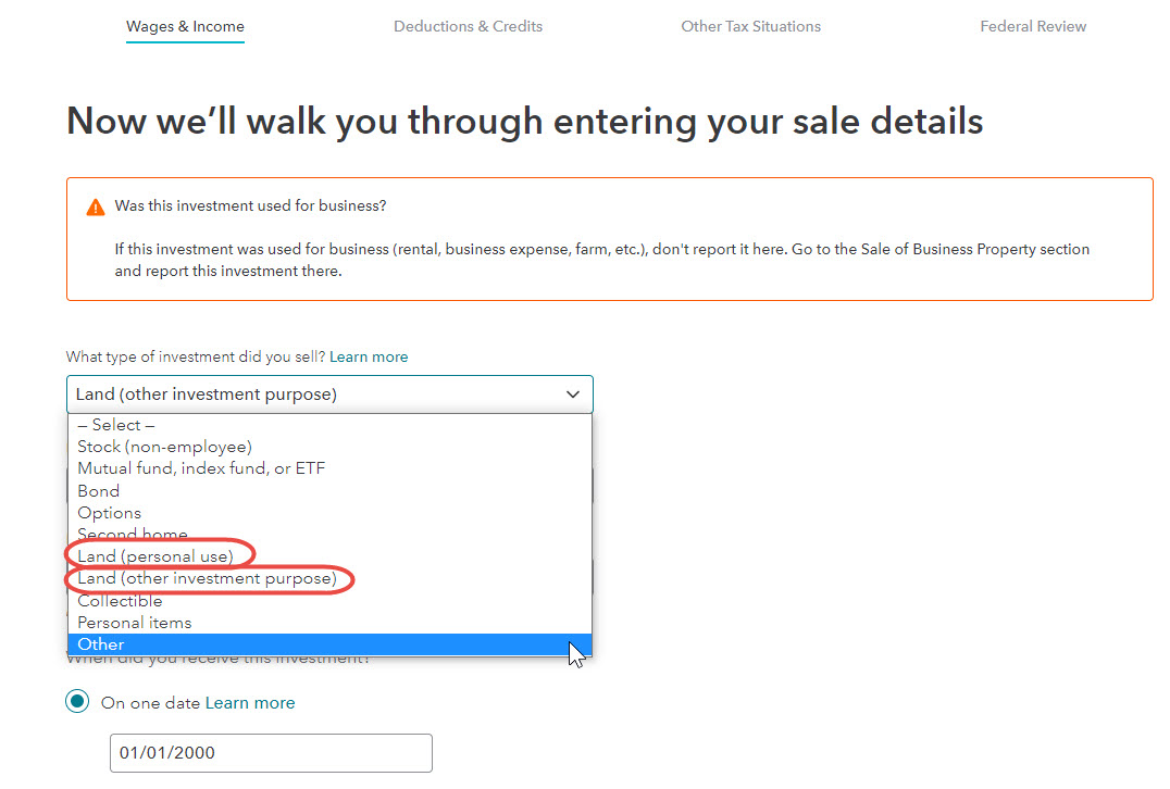A land sale is considered a sale of an investment. To report this in TurboTax, please follow these steps: